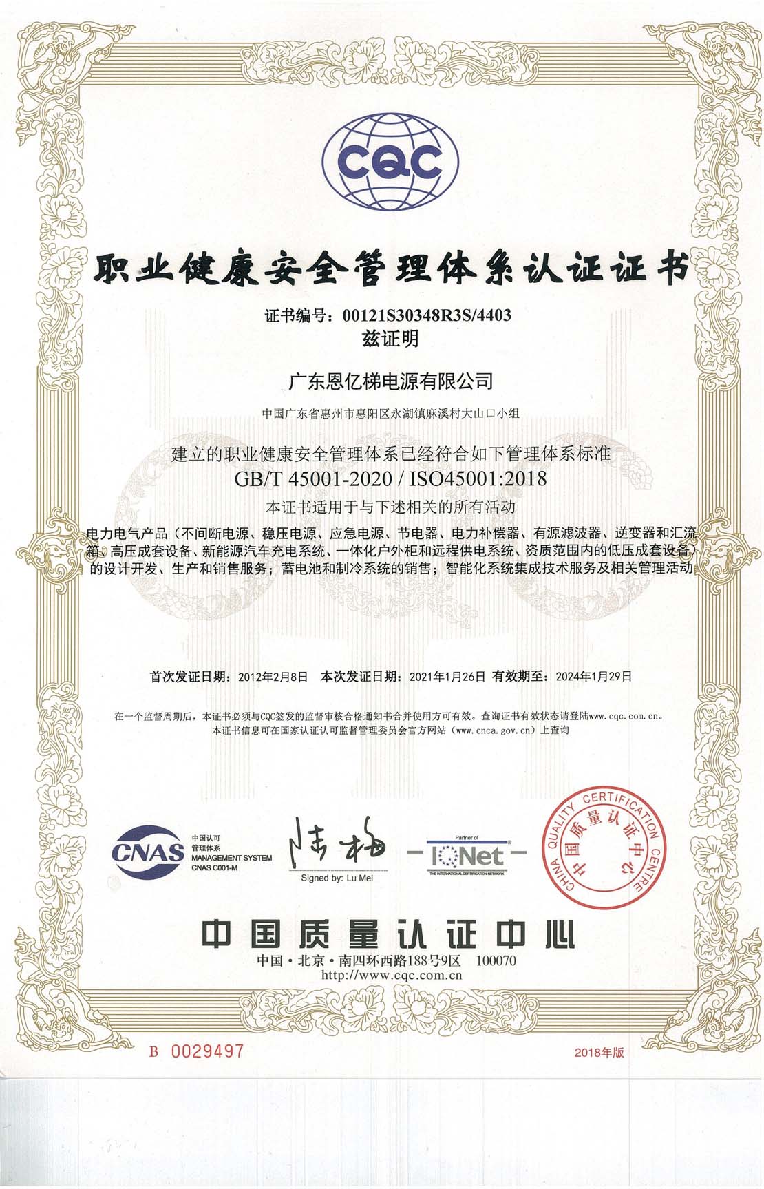 職業(yè)健康安全管理體系認(rèn)證證書