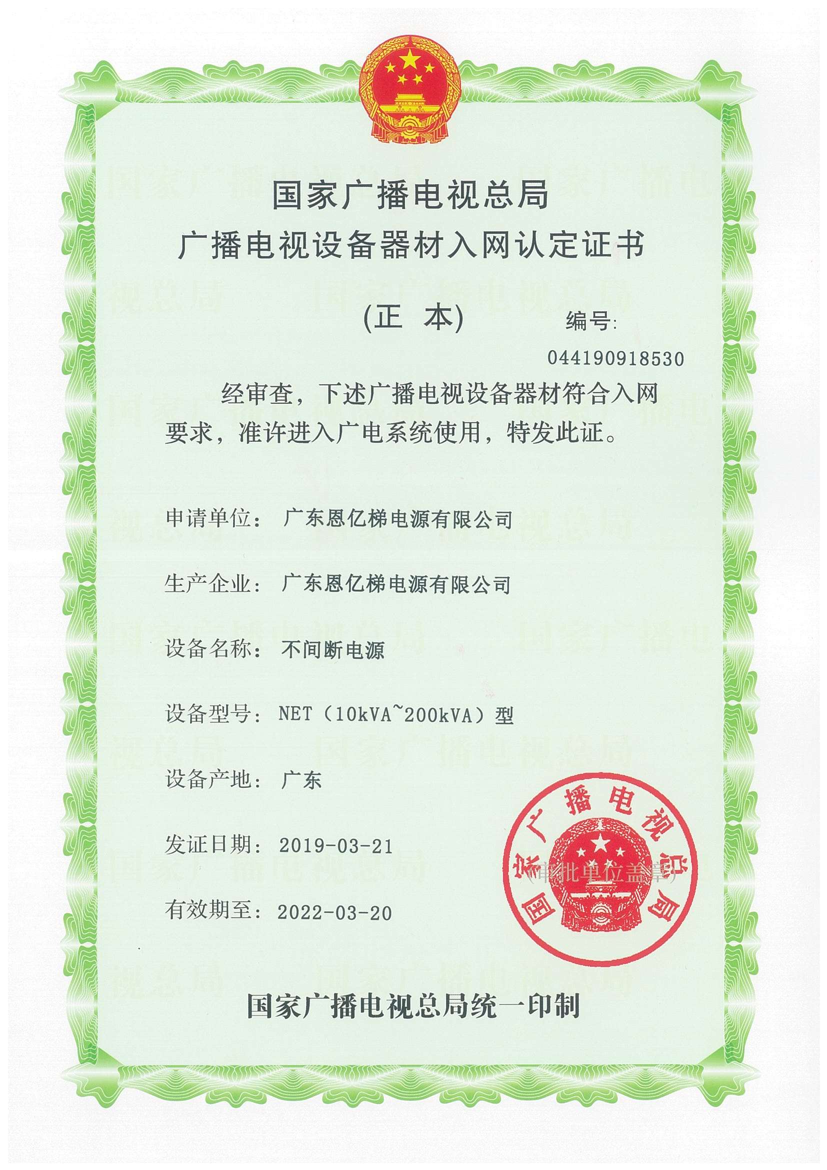 國家廣播電影電視總局入網(wǎng)認(rèn)定證書(不間斷電源)