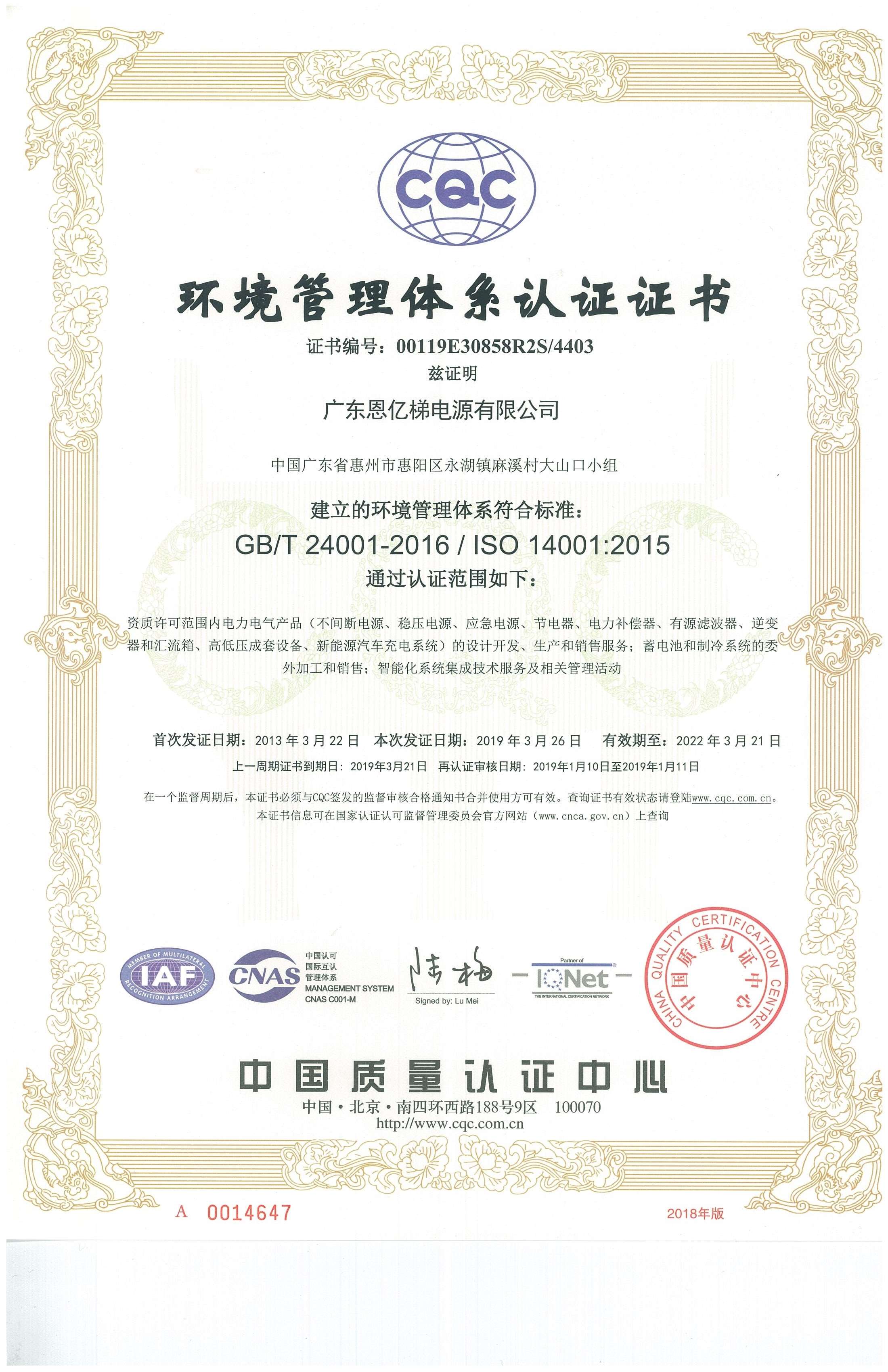 ISO14001環(huán)境管理體系認證證書